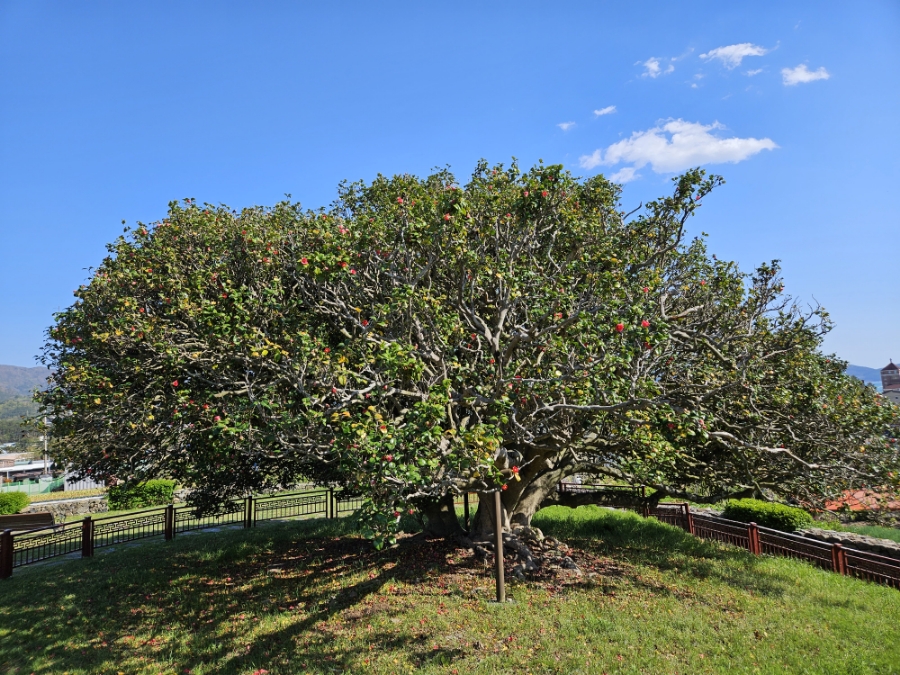 동백나무는 예부터 우리나라 남쪽 바닷가 주민들이 그 나뭇가지를 혼례상에 차려 놓고 신랑 신부의 무병장수와 굳은 약속의 징표로 삼아왔다고 합니다. 거제도 외간리 이정묵씨집 터에 동서로 각각 한 그루씩 서 있는 외간리 동백나무는 높이 7m, 수관(樹冠)은 동서7m, 남북 6m, 수령은 약 350년으로 지엽이 무성하기로 유명합니다. 또한 지상 40cm 부분의 나무둘레는 2m에 이르러 동네 분들은 이 나무를 부부나무라고 부른다고 해요. 가정의 화목과 마을의 안녕을 지켜주는 수호목으로 받들여 지고 있으며 매년 섣달 그믐날이면 동산제를 이 나무 밑에서 지낸다고 하네요. 또한 동백나무의 꽃이 골고루 피면 그해 풍년이 들고 어느 한쪽만 피면 흉년이 든다는 전설이 전해지고 있다고 하니 봄을 맞아 수려한 외양을 뽐내는 동백나무 꼭 감상해 보시기 바랍니다.