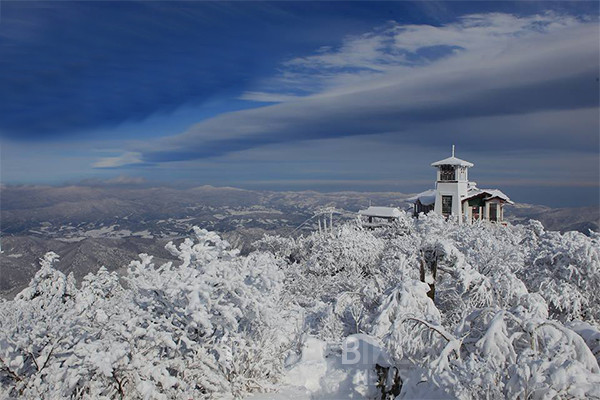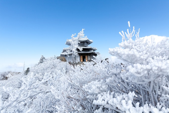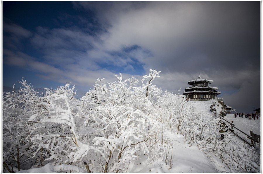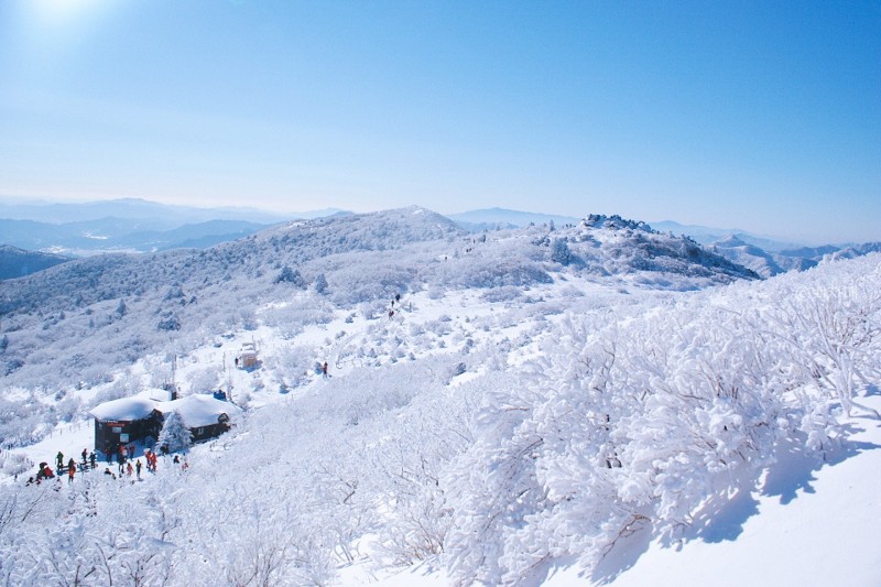 덕유산 향적봉은 눈 산행지로 유명한 곳으로 무주리조트에서 곤돌라로 올라 설천봉을 지나 정상인 향적봉(1,614m)까지 쉽게 올라갈 수 있다는 장점이 있습니다. 잠깐만 걸으면 중봉 등 주목 군락지를 만날 수 있어 볼거리가 풍부하며 산과 산을 잇는 장쾌하게 뻗어 있는 백두대간의 마루금이 눈 덮인 덕유산의 풍경을 완성시켜줍니다.