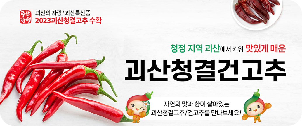괴산 고추축제는 충청북도 괴산군에서 지역 특산물인 고추를 주제로 개최하는 농․특산물 테마축제로 괴산군청 앞 광장를 비롯한 문화체육센터과 종합운동장, 동진천 일원 등에서 열리고 있습니다. 축제 기간에 전국에서 수십만 명의 관광객이 찾아올 정도로 이제는 유명한 지역 행사가 되었습니다.