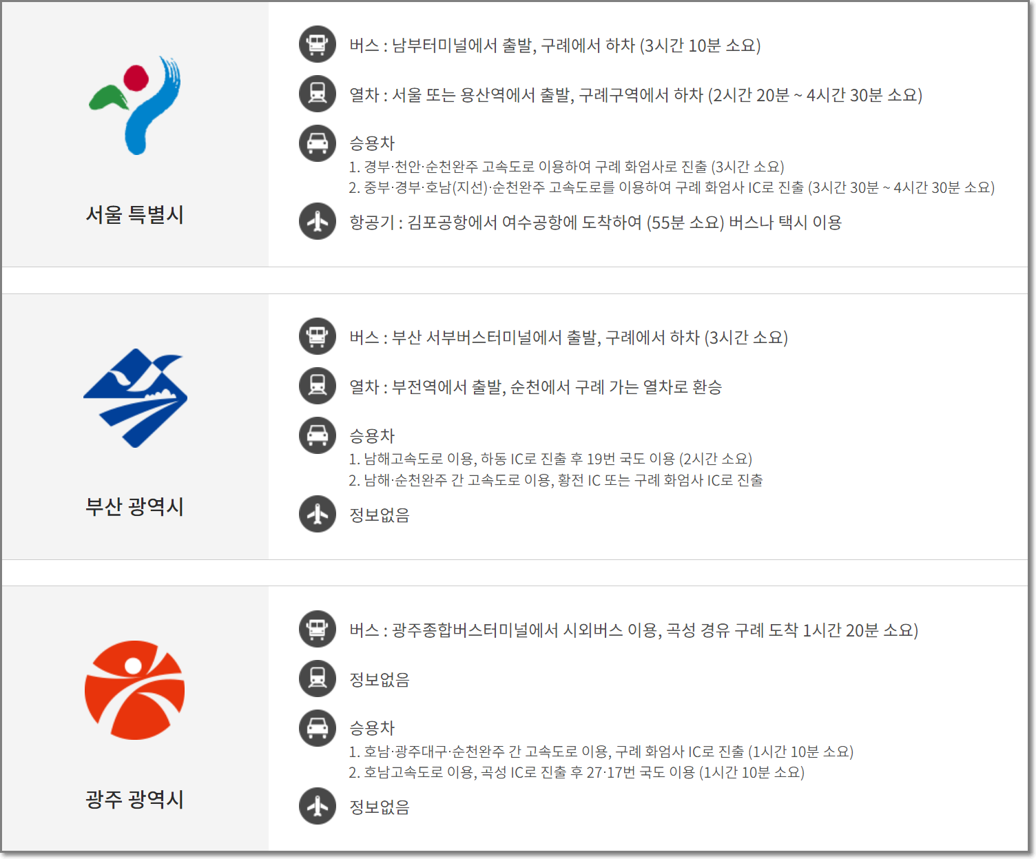 그 밖의 구례의 명소들은 노고단로를 따라 자동차로 40여 분을 오르면 닿을 수 있는 성삼재로, 이곳 주차장에서 노고단 정상까지 1시간 남짓이면 오를 수 있어 아이들과 함께 가도 좋습니다. 비교적 완만한 길이 이어져 지리산을 만나는 가장 쉬운 길이기도 합니다.