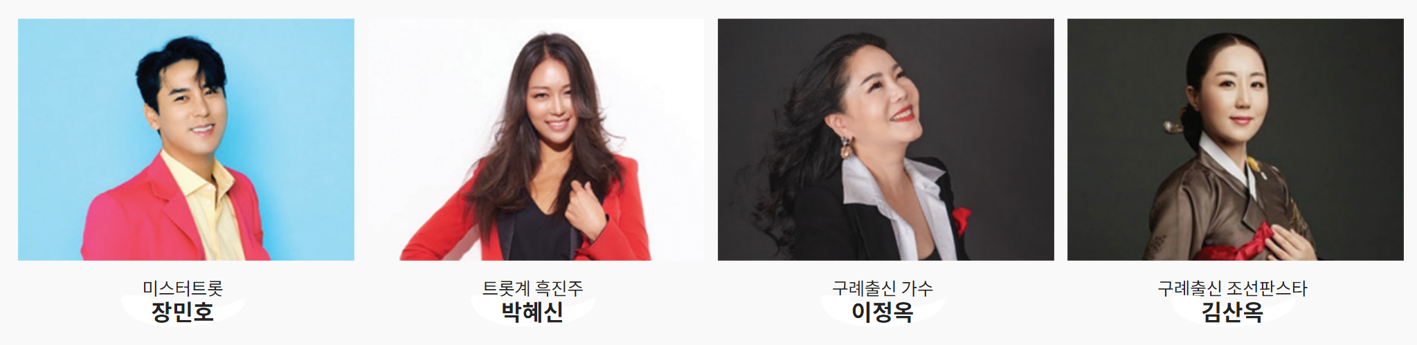 개막공연에는 TV조선 '미스터트롯2'탑6에 올랐던 트롯가수 '장민호'와 트로트계 흑진주 박혜신, MBN 조선판스타 우승자이자 구례군 출신 가수 김산옥과 구례 대표가수 이정옥이 출연할 예정입니다