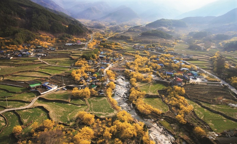 산수유마을로 불리는 구례 산동면에는 무려 11만 7,000그루가 넘는 산수유나무가 있습니다. 산동(山洞)면은 ’산동네’라는 의미로 지리산 노고단 아래 자리 잡고 있는데요, 지리산에서 흘러온 물이 산수유마을 한가운데를 가로질러 섬진강으로 흘러갑니다.