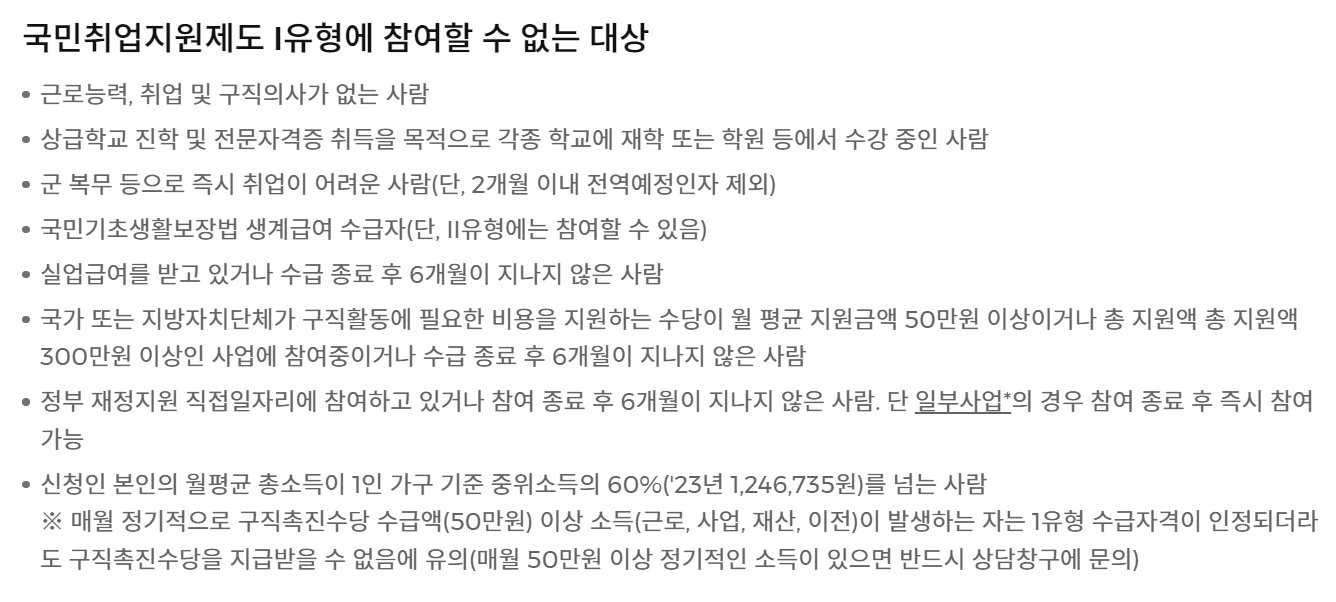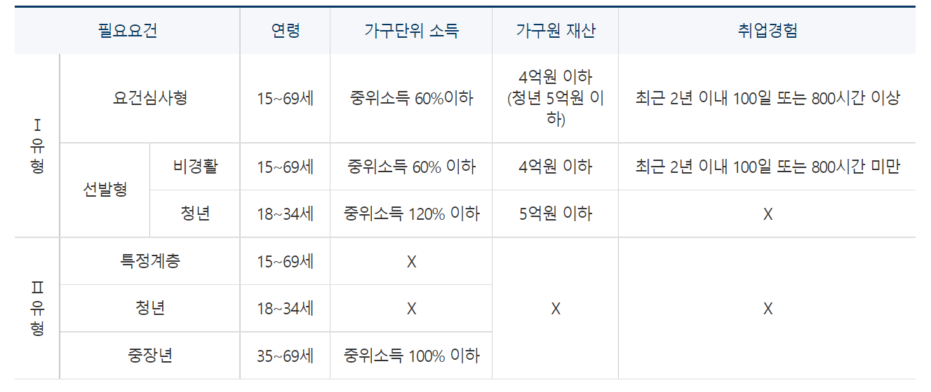 - (요건 심사형) : 15세 ~ 69세 구직자 중 가구단위 중위소득 60%이하이고, 가구단위 재산 4억 원 이하이면서 최근 2년 이내 100일 또는 800시간 이상의 취업 경험이 있을 것