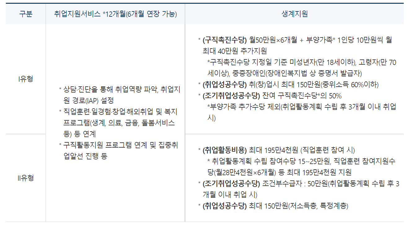 ‘구직촉진수당’과 ‘취업지원서비스’를 함께 지원하는 유형으로 대상 및 지원 내용에 따라 두 가지로 구분됩니다.