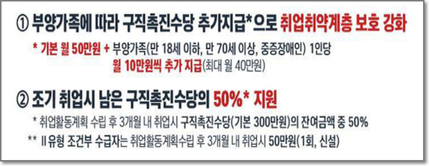 - Ⅰ유형 참여자 생활안정을 위해 최대 300만 원(월 50만원×6개월)의 구직촉진수당 지원되었는데요, 2023년부터는 부양가족(만 18세 이하, 만 70세 이상, 중증장애인) 1인당 10만원씩, 최대 40만원을 추가로 지원됩니다.