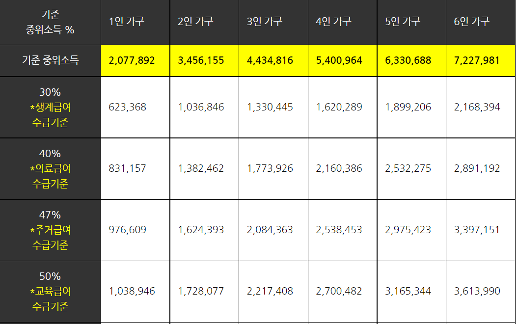 5. 중위소득 60% 산정은 2023년 기준 중위소득표를 참고하시면 됩니다.