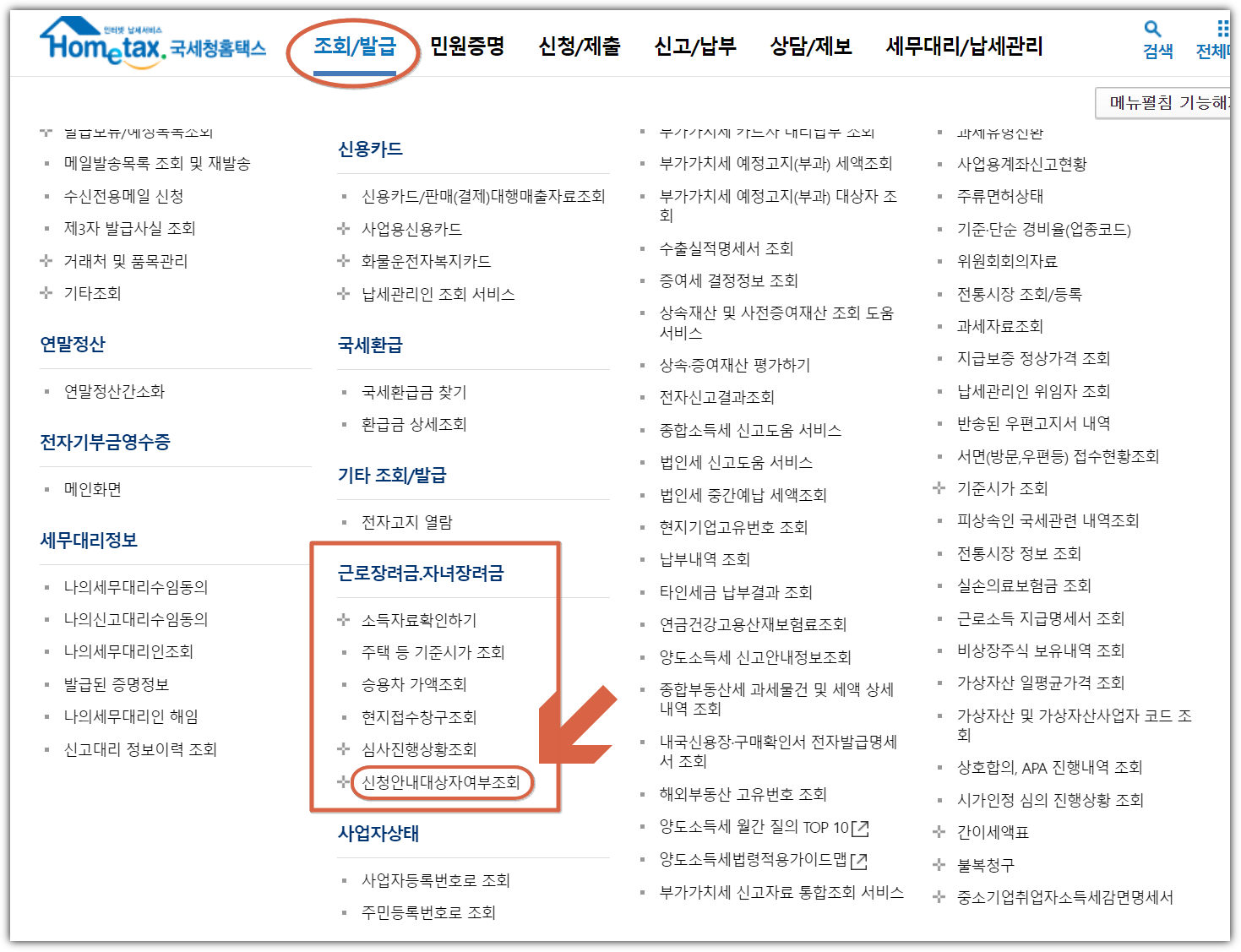 2. 조회발급 메뉴에서 근로장려금, 자녀장려금의 신청안내 대상자여부 조회