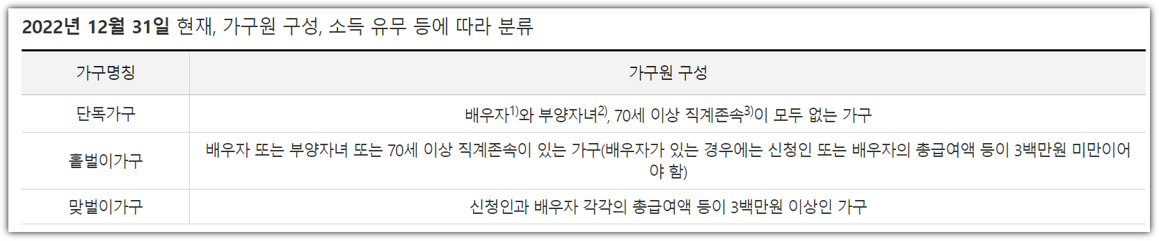 예를 들어 부모 1명과 16세 자녀, 2인 가구일 경우 16세 자녀의 연간 소득이 100만원을 넘는다면 부양자녀에 포함되지 않습니다. 이런 경우 '홑벌이가구'가 아닌 '단독가구'로 분류되니 참고하시기 바랍니다.