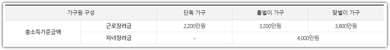 가구원 구성에 따라 2022년 부부합산 총소득금액이 기준금액 미만이어야 합니다. 또한 총급여액 등2에 의하여 근로장려금을 산정하고 있습니다.