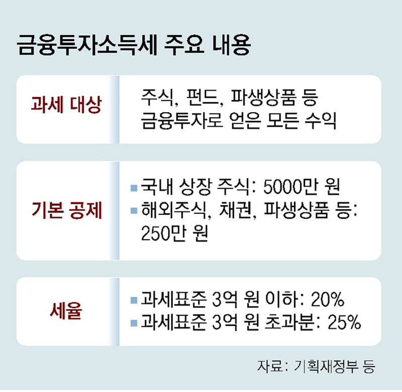 금융투자소득세 : 주식·채권·펀드 등의 금융투자 상품에서 발생하는 소득에 부과하는 세금으로 주식과 주식형 펀드는 연 5000만원 이상, 기타 주식과 상품은 250만원 이상 벌면 20%(지방세 포함 22.5%)의 세금을 내야 하며 순이익이 3억원 이상이면 최고세율인 27.5%를 세금으로 내야 함.