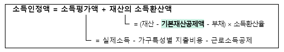 소득평가액은 실제 소득에 장애아동수당, 만성질환 의료비 등 가구특성별 지출과 근로소득의 일정비율을 공제하여 계산한다고 보시면 됩니다. 또한 재산의 소득환산액은 기본적인 생활을 유지하는데 팔요한 재산들을 공제하고나서 마지막에 소득환산율을 곱해서 계산되는 것이예요.