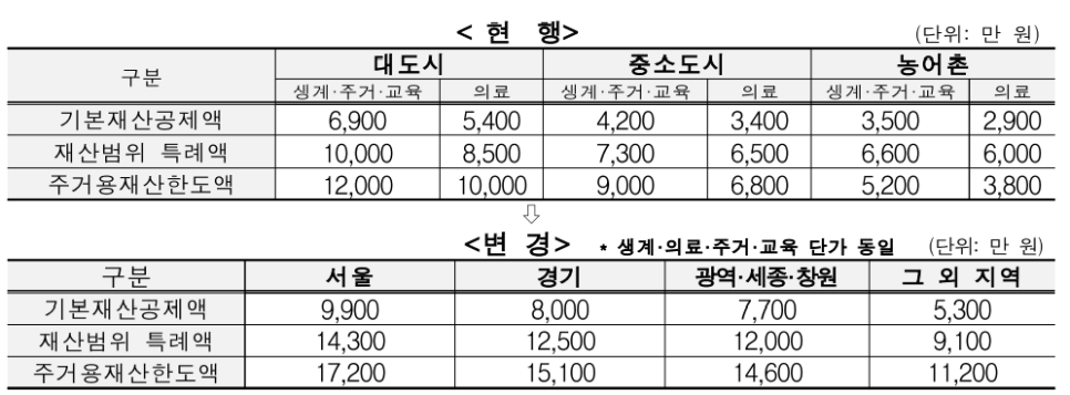 기본재산공제액이 상향되면 가구의 소득인정액이 적어지는 것이므로 기초생활보장 수급자 선정기준이 완화되는 것이라고 볼 수 있어요. 기존에는 지역별로 2900만 원부터 6900만 원까지 적용하고 있는 기본재산공제액은 2023년부터 5300만 원부터 9900만 원까지로 상향되며 이는 재산이 많더라도 가구의 소득인정액이 적어지는 효과가 있어 기초생활수급자 자격요건이 완화되는 효과가 발생합니다.
