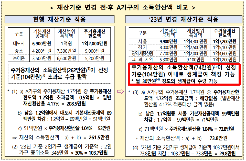 거주 중인 주거용재산에 대해서는 재산액을 산정할 때 일정 금액(주거용 재산 한도액) 이하에 대해 낮은 환산율을 적용하고 있습니다. 이를 높여 더 많은 사람이 수급자로 선정되게 한 것입니다.