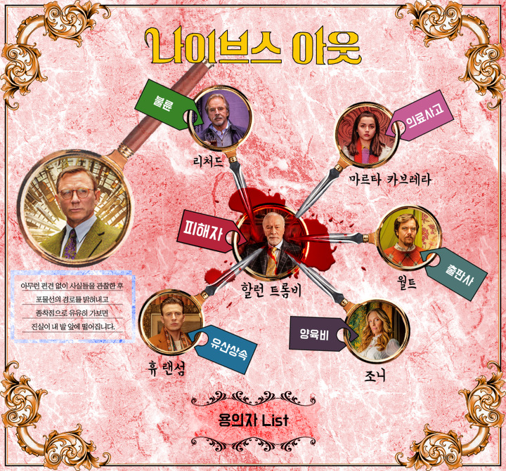 나이브스 아웃의 주연을 맡은 다니엘 크레이그는 대본이 너무 재밌고 독특한 캐릭터에 매료되어 캐스팅을 수락했다는 인터뷰를 한 적이 있는데요, 그만큼 나이브스 아웃은 잘 짜여진 각본과 뻔하지 않은 스토리로 많은 관객들의 호평을 받았던 작품입니다.