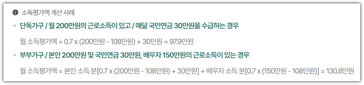 - 국민연금 급여액 550,000원 + 근로소득 294,000원{(150만 원 - 108만 원) × 0.7} = 844,000원