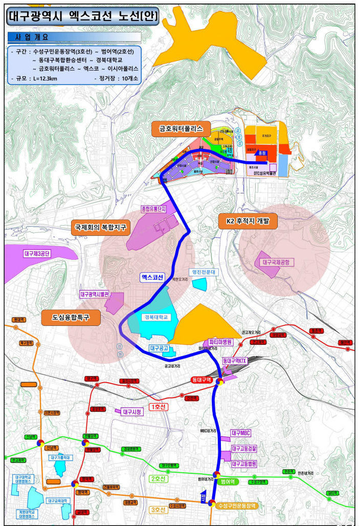 대구시가 발표한 대구 엑스코선 기본계획안에 따르면 대구엑스코선은 수성구민운동장역-동대구역-대구시 산격청사-경북대학교-종합유통단지-엑스코-금호워터폴리스-이시아폴리스로 이어질 것으로 보입니다.