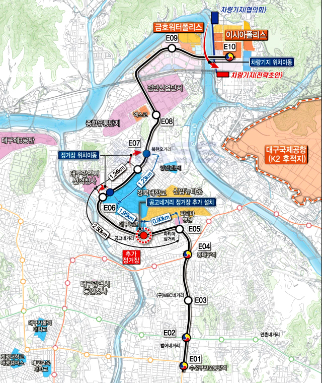 대구시에 따르면 차량기지 같은 경우 앞으로 연경지구 쪽으로의 연장 혹은 K2 후적지 개발과 관련된 향후의 장래성을 고려해서 경부고속도로 남쪽 농경지 쪽으로 위치를 변경한다고 합니다.