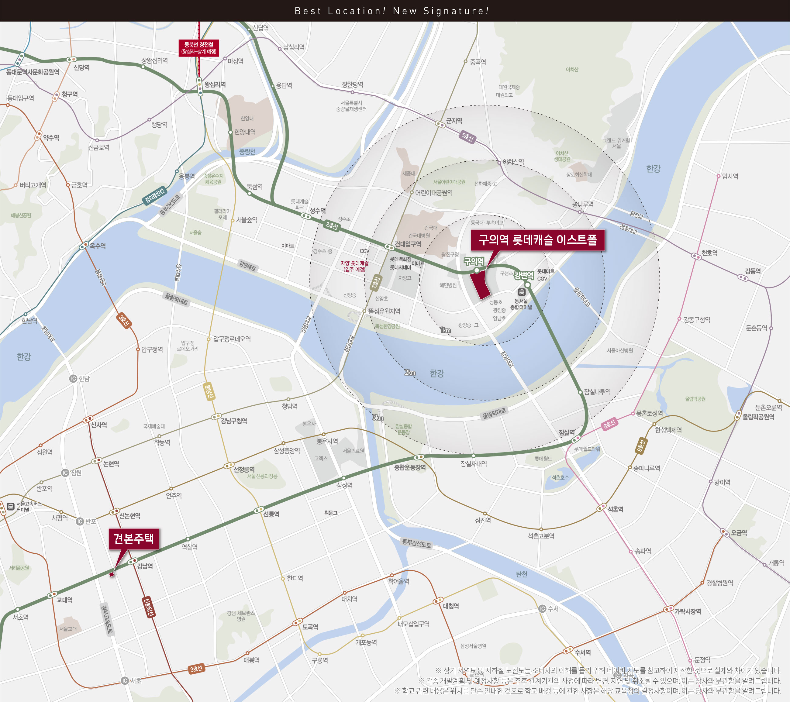 물론 단지 바로 옆에 전철역이 있다는 건 강점이라고 볼 수 있는데요, 롯데캐슬 이스트폴은 지하철 2호선 구의역과 인도를 사이에 두고 붙어 있는 정도이기 때문에 걸어서 5분 내에 이동할 수 있는 거리인데다 해당 전철역으로 강남을 포함한 서울 전역으로 이동이 가능합니다.게다가 동서울 종합터미널은 도보로 10분 내에 도착할 수 있는 반경 600m 내에 위치하고 있어 이를 통한 외곽 지역 이동도 용이하다는 평가입니다.