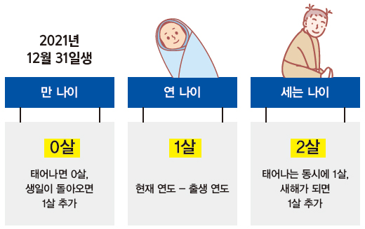 한국은 법적으로 만 나이와 연 나이를 혼용해서 쓰고 있고, 사회적으로는 세는 나이를 쓰고 있습니다. 먼저 한국식 나이라고도 불리는 '세는 나이'는 태어났을 때 나이가 1살이라고 보는 것입니다. 이후 한 해가 지날 때마다 한 살씩 더하는 것인데요, 이에 따라 12월 31일에 태어난 아기는 다음 날 2살이 되는 경우도 있습니다.