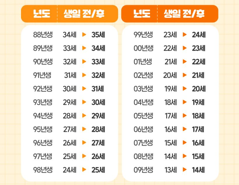 한국은 1962년 이후 민법상 만 나이를 공식 채택하고 있지만, 행정 업무상 사실상 연 나이를 적용하는 경우가 많았는데요, 개정안 시행 후에는 나이에 관한 별도 규정이 없다면 '만 나이'를 기준으로 하는 것이라고 보시면 됩니다.