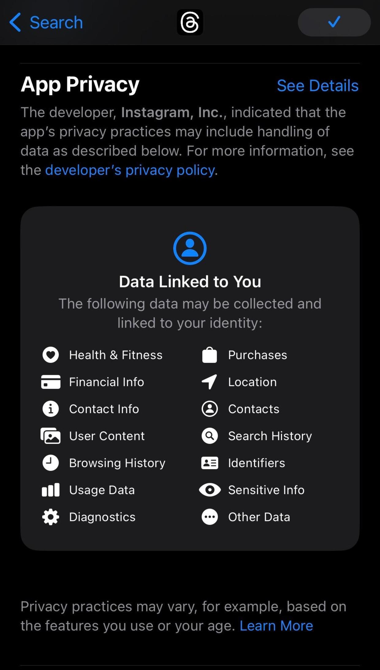 스레드는 위치 데이터, 구매 기록, 검색 기록 등 사용자 휴대전화의 다른 데이터 또한 기능으로 통합시킬 수 있으며 텍스트 기반의 대화 앱이라는 설명입니다.