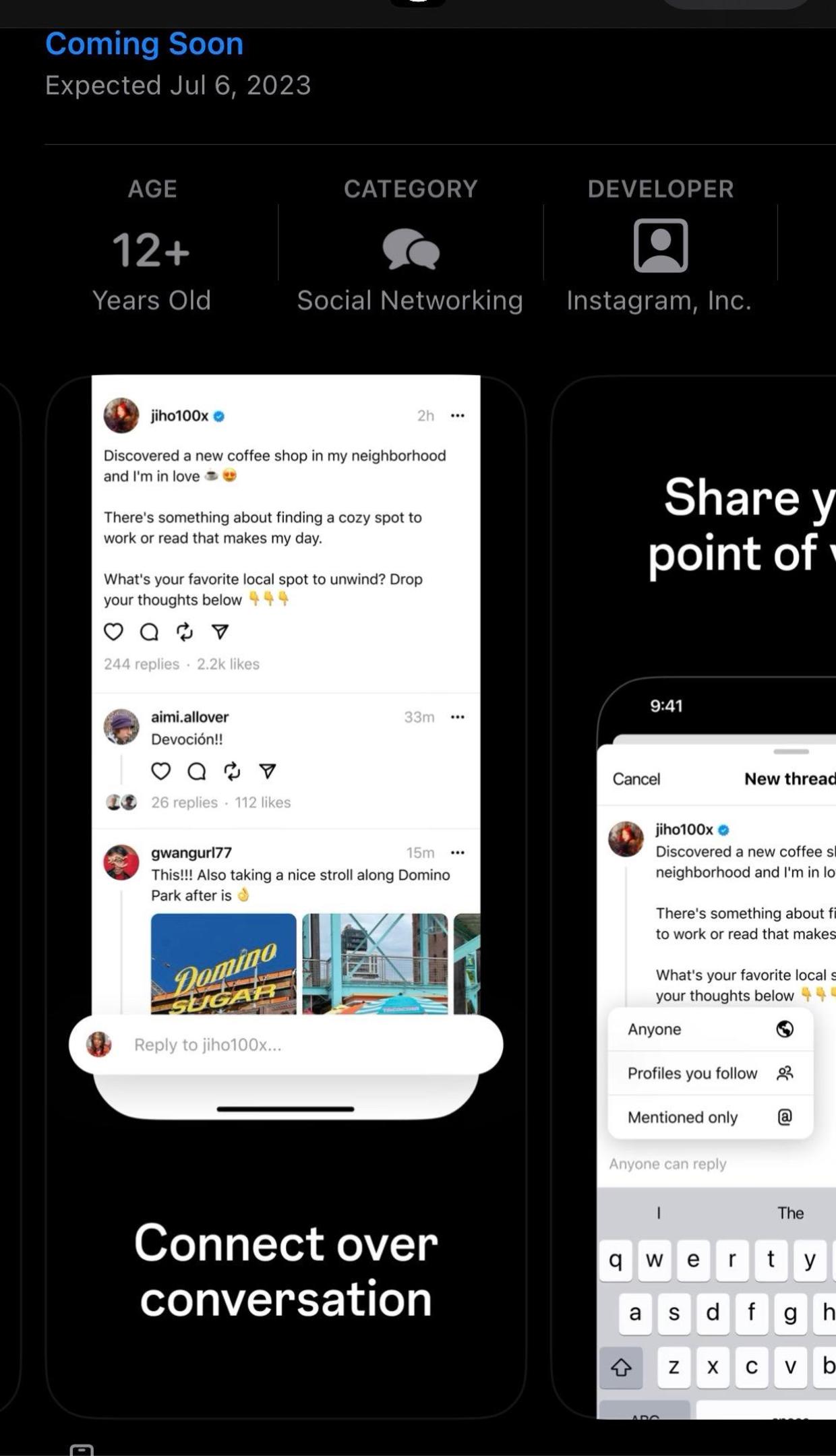 따라서 유럽 지역에서는 메타가 새로운 규제인 디지털 시장법에 대한 가이던스를 기다리고 있는 상황이며 나머지 지역에서는 6일 출시됩니다. 다만, 100개 이상 국가에서 스레드 서비스를 시작할 것이라고 밝혔지만, 메타 측이 아직 전체 국가의 리스트는 공개하지 않았습니다.