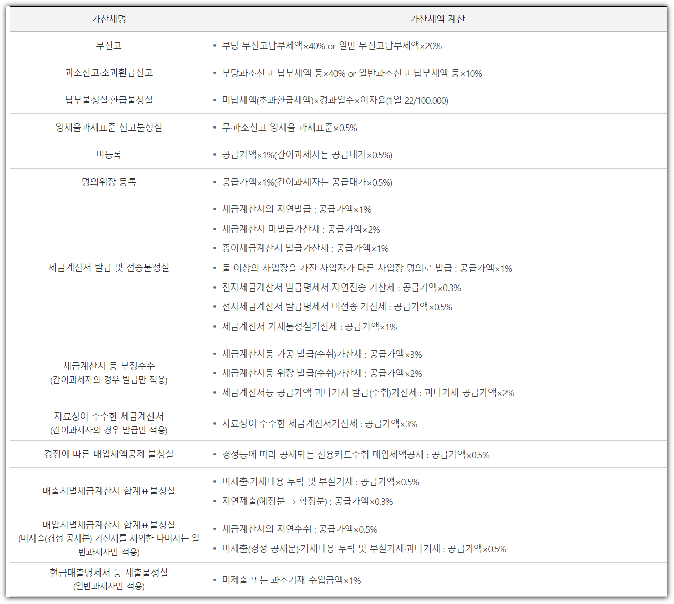 부가가치세를 신고하지 않을 경우 ‘가산세’가 발생할 수 있으며 무신고 가산세, 과소신고 가산세, 납부지연 가산세, 무기장 가산세 등, 상황에 따라 다양한 가산세율이 적용될 수 있으니 참고하시기 바랍니다.