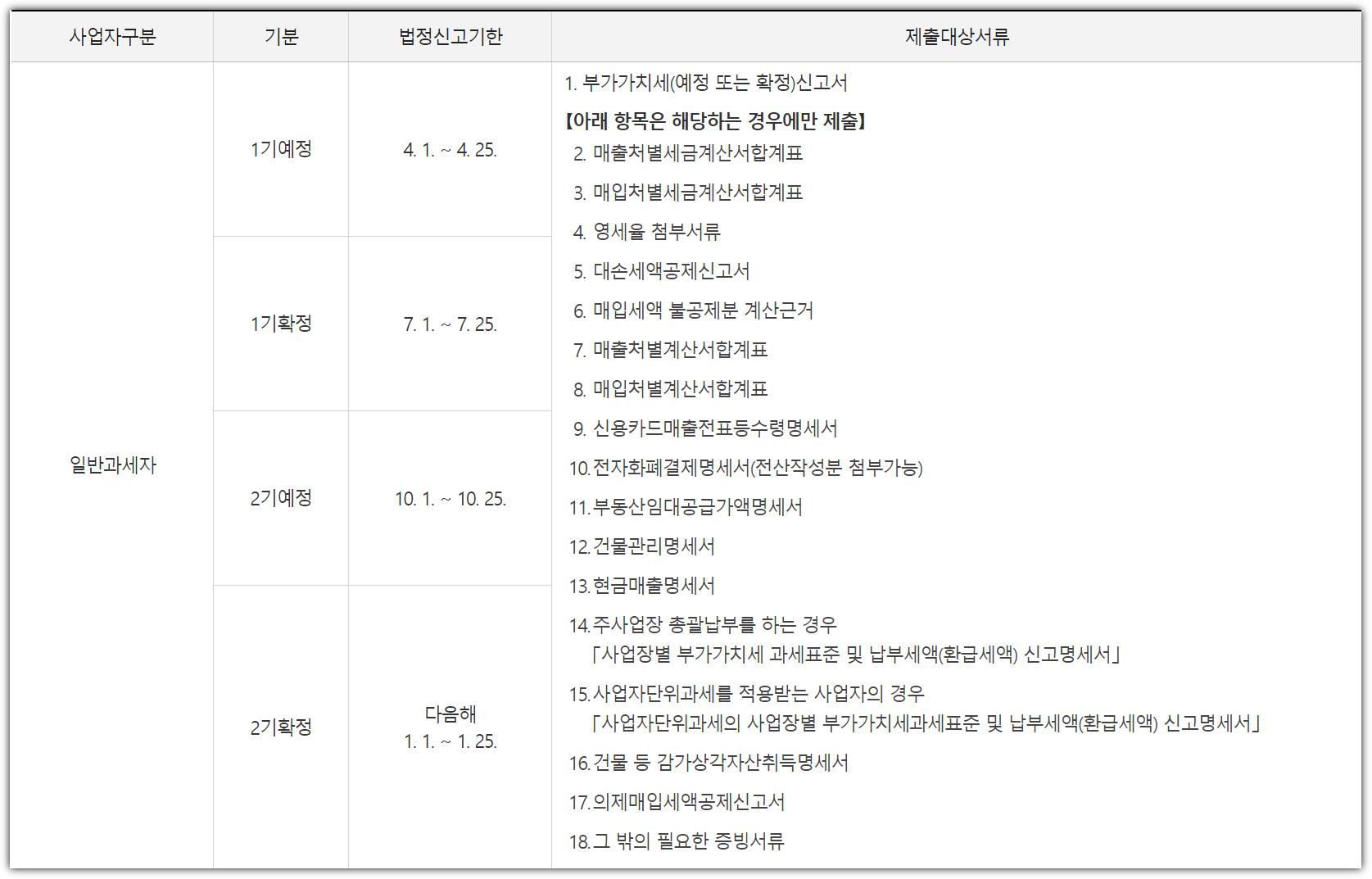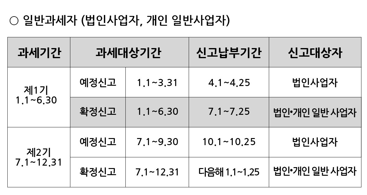 📌 일반과세자 부가세 과세기간 : (1기) 1/1~6/30, (2기) 7/1~12/31