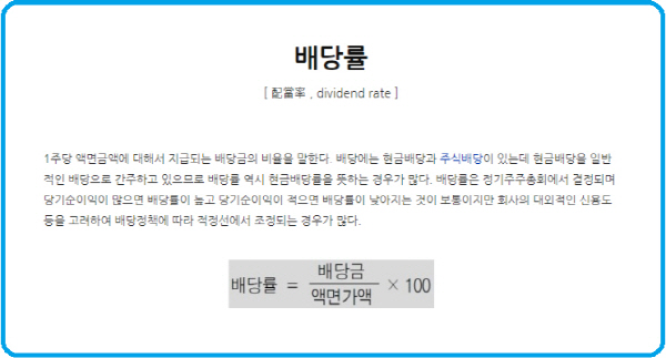 ※ 배당률 : 1주당 액면금액에 대하여 지급되는 배당금의 비율. 배당금을 액면금액으로 나누면 배당률이 나옴.