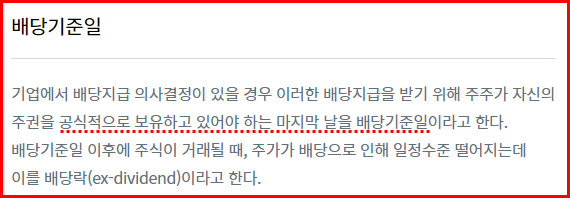 ※ 배당락 : 배당을 받을 권리가 없어진 상태. 배당락일이 도래하여 주식을 매수하게 되면 기업의 배당금 지급 일정에 따라 그 분기 혹은 다음년도에 해당하는 배당금을 받을 수 없게 됨. 예를 들어 배당락일이 2022년 12월 16일 이라면 배당락일 하루 전에는 주식을 매수해야 함.