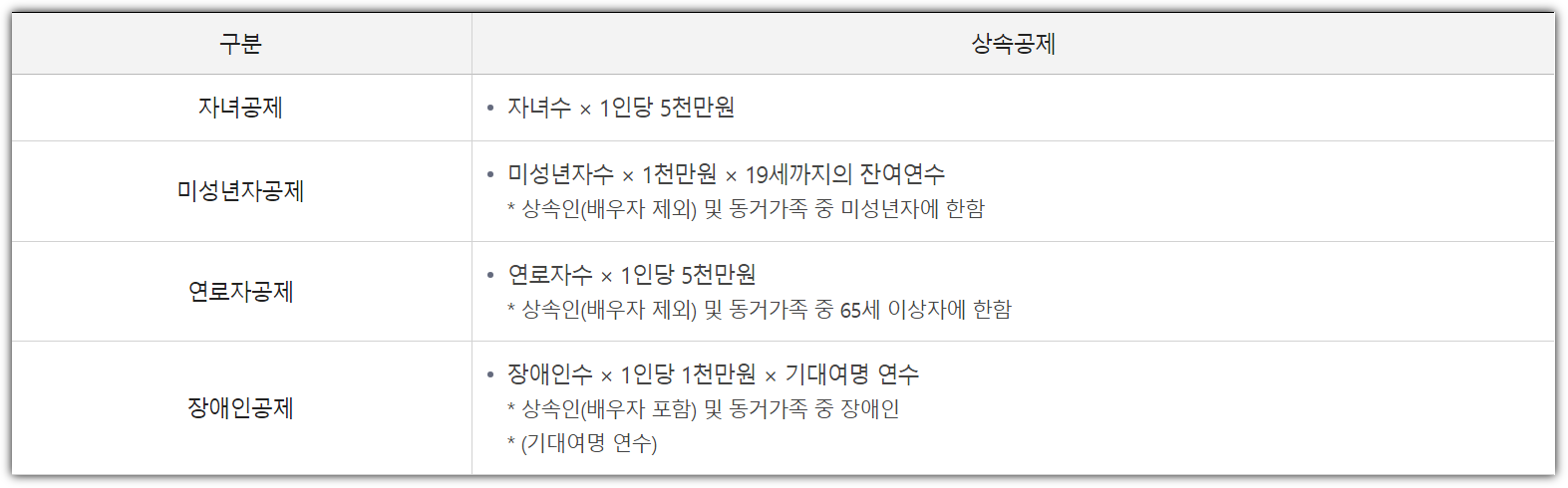 ▶ 미성년자공제 : 상속인 및 동거가족 중 미성년자에 대해서는 만 19세가 될 때까지 잔여 연수에 1천만 원을 공한 금액을 공제