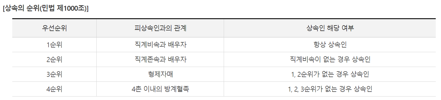 상속세는 상속개시(피상속인의 사망 또는 실종)라는 사실에 따라 피상속인으로부터 상속인에게 이전하는 재산에 대해 그 재산가액을 과세표준으로 하여 상속인에게 과세하는 조세를 말합니다. 별도의 유언이 없는 경우 상속은 직계비속과 배우자가 1순위가 되는데요, 직계존속과 배우자가 2순위, 형제자매가 3순위, 4촌 이내 방계혈족이 4순위가 됩니다.