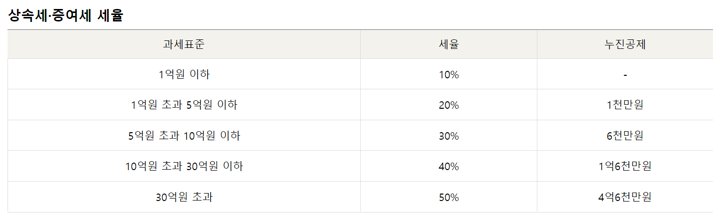 먼저 과세 표준이 1억 원 이하라고 하면 적용되는 상속세율은 10%이며 누진공제액은 없습니다. 과세표준 금액이 5억 원 이하이면 적용되는 상속세율은 20%이고, 이때의 누진 공제액은 1천만 원이 됩니다. 과세표준 금액이 10억 원 이하라고 하면 상속세율은 30%가 적용되며, 이때의 누적 공제액은 6천만 원이 됩니다. 마지막으로 30억 이하일 경우 적용되는 상속세율은 40%이고, 이 때의 누진 공제액은 1억 6천만 원, 과세표준이 30억을 초과하는 경우라면 적용되는 상속세율은 50%이고, 이 단계에서의 누적 공제액은 4억 6천만 원이 됩니다.