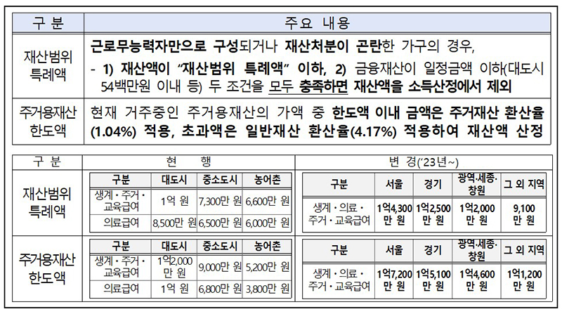 또한 재산 범위 특례액은 1억 4300만 원(서울), 1억 2500만 원(경기), 1억 2000만 원(광역·세종·창원), 9100만 원(그 외 지역)으로, 주거용 재산 한도액은 1억 7200만 원(서울), 1억 5100만 원(경기), 1억 4600만 원(광역·세종·창원), 1억 1200만 원(그 외 지역) 등으로 상향되었습니다.
