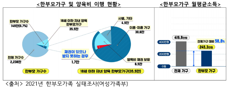 한부모가구는 2022년 기준 약 149만 가구로, 전체의 약 6.7%에 이릅니다. 2021년 가계금융·복지조사에서는 한부모가구의 월평균 소득이 약 245만 원으로 조사됐는데, 전체 가구 가처분소득 약 417만 원의 58.8% 수준에 불과했습니다. 게다가 18세 이하 자녀를 양육하는 한부모가구는 35만5000가구인데, 절반가량인 19만 가구가 기준중위소득 63% 이하인 저소득가구입니다. 무엇보다, 한부모가구의 80.7%가 비양육부모로부터 양육비도 받지 못하는 상황(2021년 한부모가족 실태조사)이라는 데 문제가 있습니다.