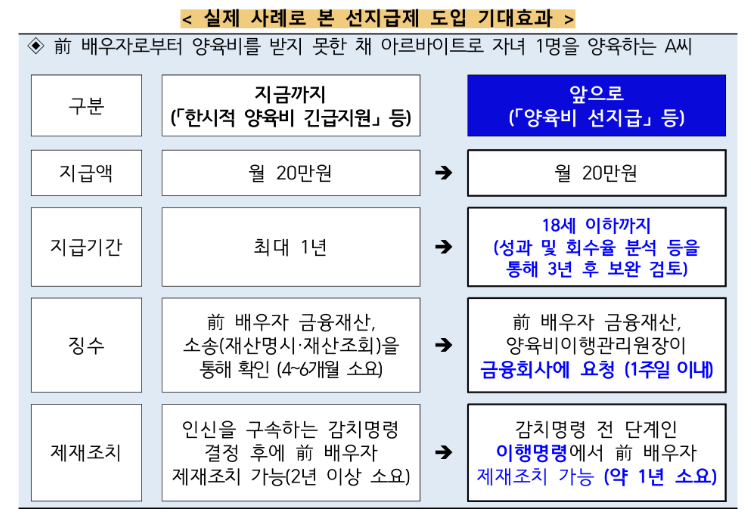 양육비 선지급제는 기존 '한시적 양육비 긴급지원'을 확대·전환하는 것으로, 미지급된 양육비를 국가가 먼저 주고, 비양육자로부터 나중에 받아내는 제도입니다. 과거 윤석열 대통령의 대선 공약이기도 합니다.