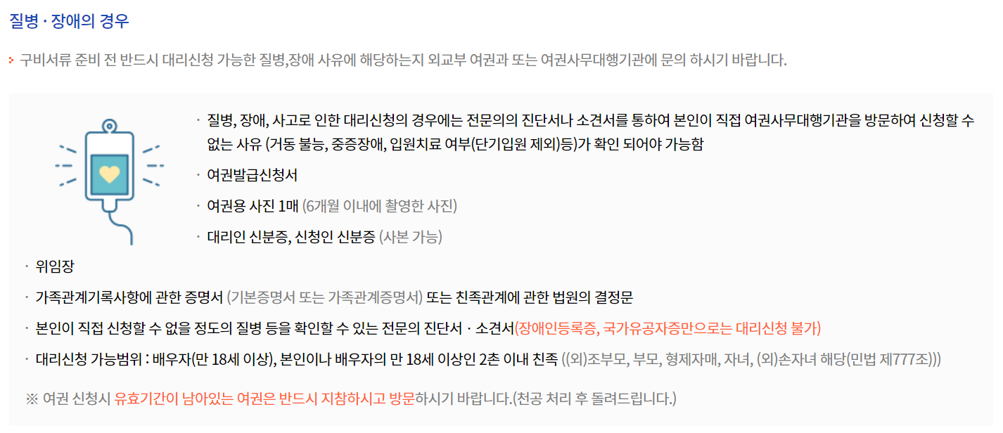 * 질병·장애의 경우: 전문의의 진단서나 소견서를 통하여 본인이 직접 여권사무대행기관을 방문하여 신청할 수 없는 사유(거동 불능, 중증장애, 입원치료 여부(단기입원 제외)등)가 확인 되어야 가능함