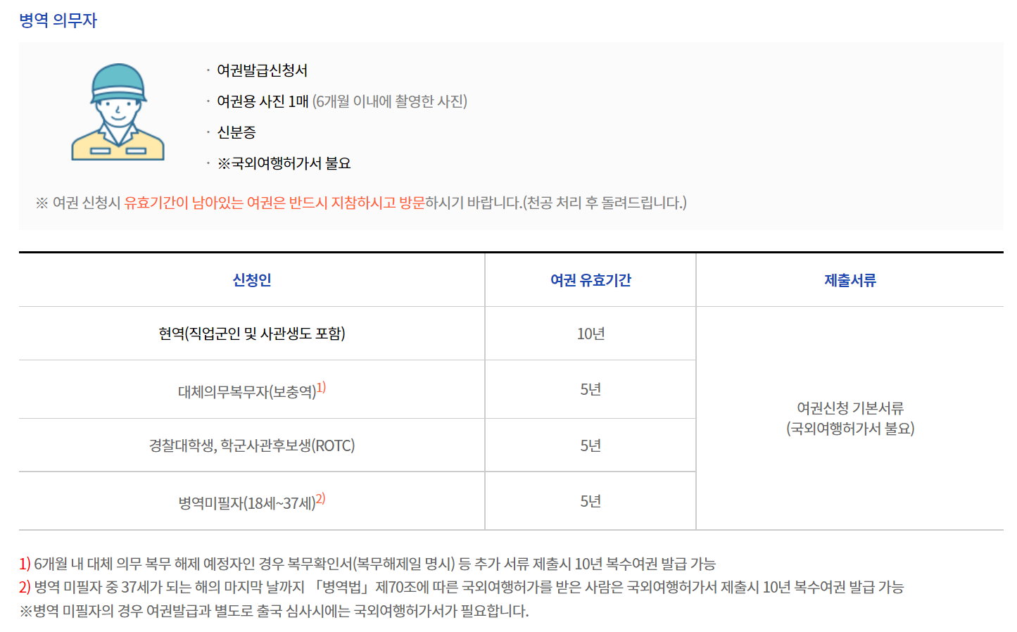 병역 미필자 (18세~37세) : 제출 서류 없음, 5년 복수여권 발급 (단, 여권발급과 별도로 출국시에는 국외여행허가서 필요)