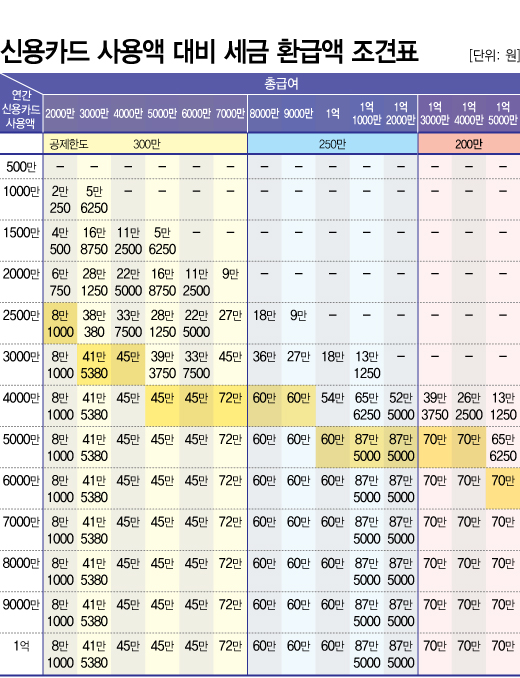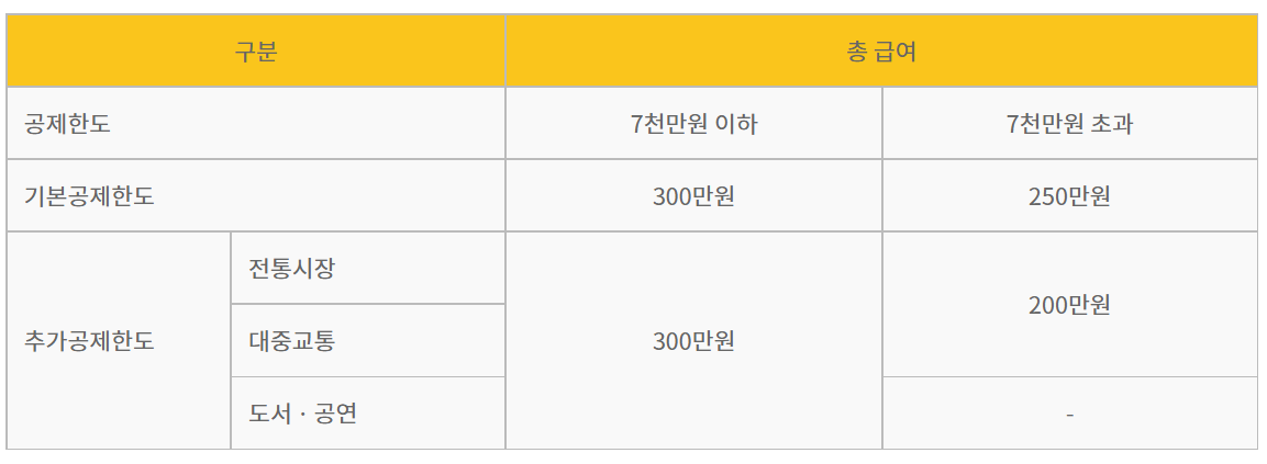 즉, 한 해 동안 카드사용금액이 얼마 인지와 상관없이 연간 총 급여액이 7천만원 이하라면 300만원까지만 소득공제 받을 수 있는 것입니다. 이 밖에 전통시장 사용분 100만 원, 대중교통 사용분 100만 원, 도서 공연 등 사용분은 100만 원의 추가 한도가 적용되지만 이들 모두 최대치로 적용을 받는 것은 거의 불가능하다고 볼 수 있습니다.
