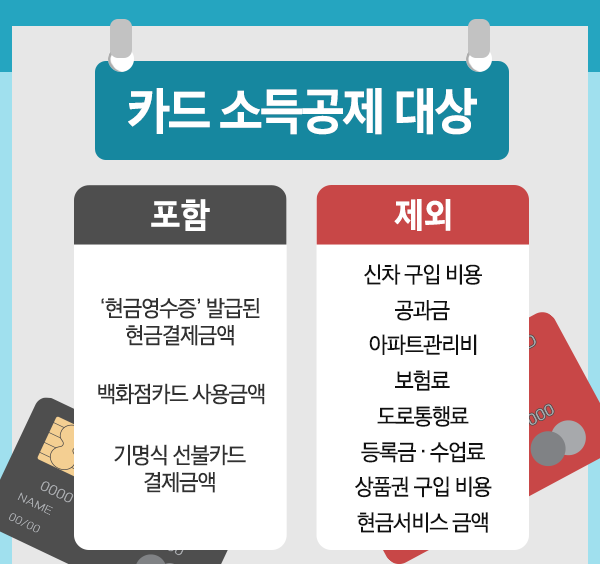 ● 연말정산 신용카드공제 제외 대상 : 통신비, 공과금, 세금, 아파트관리비, 자동차리스비용, 해외결제금액, 현금서비스, 신차 구입비용 등