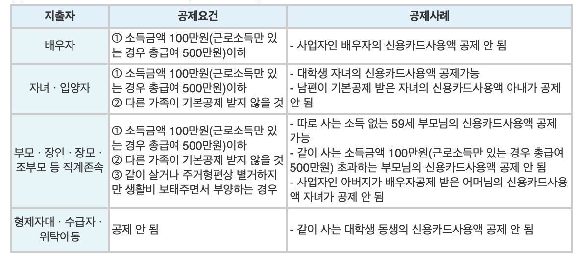 또한 연말정산 신용카드공제는 연간 100만원의 이하(근로소득만 있는 경우 총급여액 500만원 이하) 소득금액 기준만 적용되고 연령 제한 기준은 없기 때문에 소득 기준만 부합하면 정식 기본공제 대상자가 아닌 만 20세 초과 자녀와 만 60세 미만 부모님의 명의로 지출된 신용카드 금액도 소득공제가 될 수 있습니다. 따라서 배우자의 연간 소득금액이 100만원(근로소득만 있는 경우 총급여액 500만원)을 초과한다면 본인과 배우자가 각자 따로 공제를 받아야 합니다.