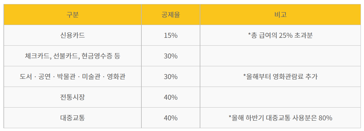 ● 도서 및 공연 등 : 30% (총소득 7,000만 원 이하인 사람들에게만 별도 30% 공제 적용)