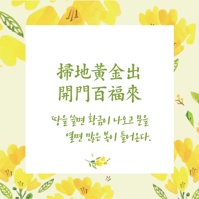 ■ 소지황금출(掃地黃金出) 개문백복래(開門百福來):땅을 쓸면 황금이 나오고 문을 열면 많은 복이 들어온다.