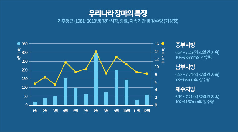 통상 제주는 6월 19일, 남부지방은 23일, 중부지방은 25일 장마가 시작되는 것으로 알려져 있습니다. 우리나라 장마의 특징을 살펴보면 최근 30년(1981~2010년) 우리나라 장마의 평균 기간은 약 31~32일이지만 장마 예상기간 동안 실제 강수일수는 평균 16.1일이었다고 합니다. 월별 강수량과 강수일수는 장마가 한창인 7월이 가장 높다고 볼 수 있는데요, 이 때문에 7월 중 휴가로 국내 여행을 준비하고 계신 분들은 일기예보를 살펴보고 계획을 짜시는 것이 좋습니다.