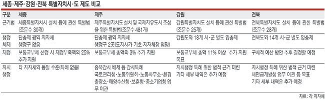 현행 지방자치법에 규정된 지방자치단체의 종류는 2가지입니다. 하나는 ‘특별시, 광역시, 특별자치시, 도, 특별자치도’이고 다른 하나는 ‘시, 군, 구’ 인데요, 서울 이외에 ‘특별’이란 명칭이 들어간 자치단체는 제주특별자치도와 강원 특별자치도, 세종특별자치시가 있습니다. 이처럼 특별자치시와 특별자치도가 되면 행정체제의 특수성을 고려해 별도 법률에 따라 행정·재정 운영을 비롯하여 지위·조직 등에 특례가 부여됩니다.