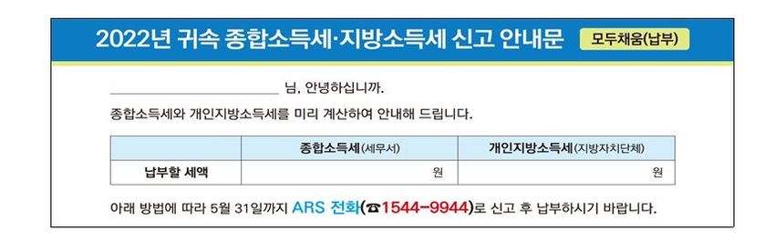 지금까지 종합소득세율 (종합소득세 과세표준)을 알아봤습니다. 종합소득세 납부가 어려운 분들이라면 국세청에서 모두채움 서비스를 제공하기도 하는데요. 모두채움 서비스는 국세청에서 소득세 신고서의 모든 항목을 미리 작성해 납부할 세액을 제공하는 것을 말합니다.