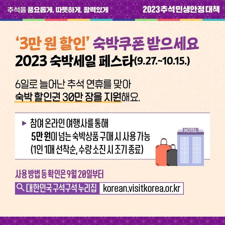 6일로 늘어난 추석 연휴를 맞아 숙박 할인권 30만 장을 지원하는 것으로 참여 온라인 여행사를 통해 5만 원이 넘는 숙박상품 구매시 사용 가능 (1인 1매 선착순 수량 소진 시 조기종료)