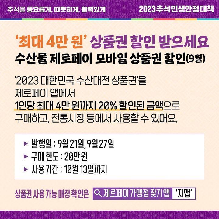 ‘2023 대한민국 수산대전 상품권’을 제로페이 앱에서 1인당 최대 4만 원까지 20% 할인된 금액으로 구매하고, 전통시장 등에서 사용 가능