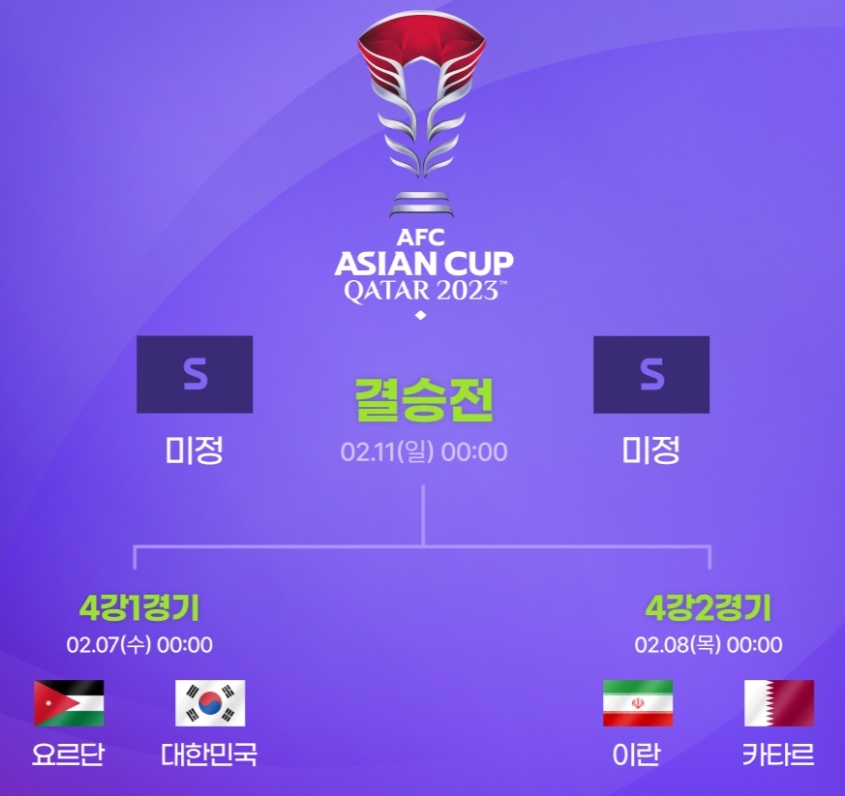 지금까지 축구 결승전 일정 중계 날짜 대진표 (아시안컵 축구 경기일정)을 정리했습니다. 한국은 7일 0시(6일 자정) 카타르 아흐마드 빈 알리 스타디움에서 요르단과 준결승전을 치르고 이란은 개최국 카타르와 다음날 같은 시각에 4강전을 벌입니다. 한국이 결승에 오르면 이란-카타르전 승자보다 하루 더 쉬게 되는 셈인데요, 축구 결승전은 설 연휴 기간인 11일 0시(10일 자정)입니다.