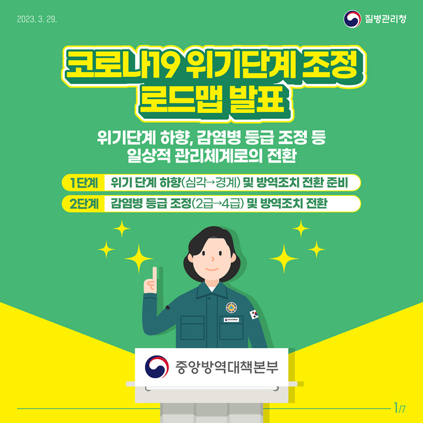 이 회의에서 만약 코로나 위기단계가 '경계'로 하향되면 국무총리가 본부장을 맡아 범부처로 대응하던 중대본은 해체하고 보건복지부 산하 중앙사고수습본부가 관련 업무를 총괄하게 되며 코로나 확진자 격리기간을 7일에서 5일로 단축하는 것입니다. 또한 일요일을 제외하고 매일 발표하던 코로나19 확진자 통계는 주간 단위로 전환한다고 합니다.